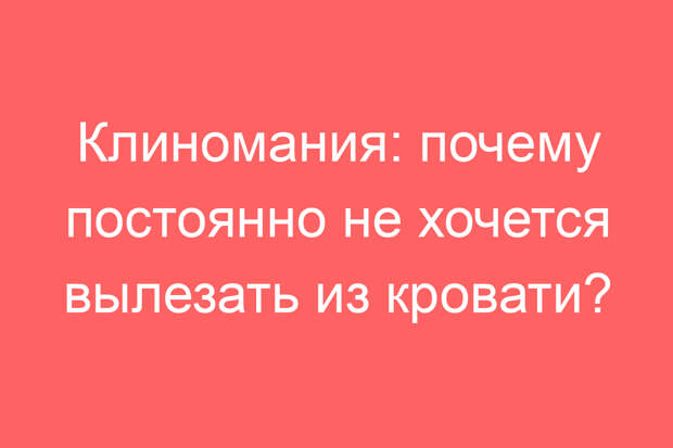 Не может встать по утрам и стремится как можно скорее оказаться в своём спальном месте на протяжении всего дня. В выходные такие люди могут смотреть телевизор, слушать музыку или читать книги, но делают всё это лёжа на кровати, отвергая любые предложения куда-то пойти. При этом очевидных проблем со здоровьем нет, врач не прописывал постельный режим, организм способен двигаться, следовательно явных причин подобного поведения не наблюдается.Что такое клиномания?